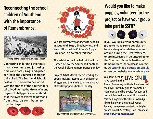 To help people to understand what the Southend Schools Festival of Remembrance is all about we have produced a leaflet that explains what we are doing, how we are doing it, who we are doing it with and when and where our exhibition is being held. Click on the image below to download the SSFR Leaflet PDF
